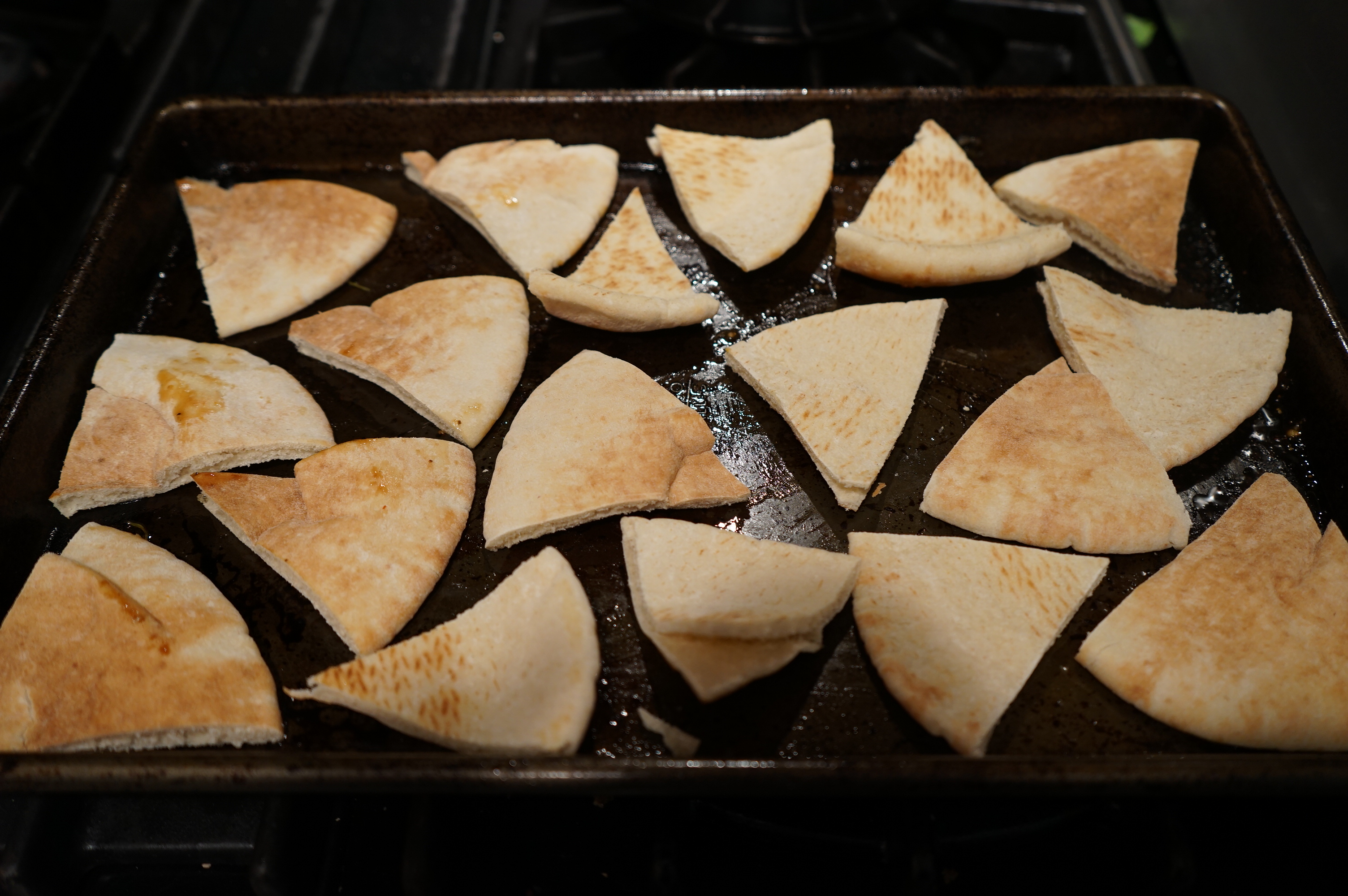 - Toss the pita triangles with the herb oil to lightly coat, and arrange in a single layer on a baking sheet
