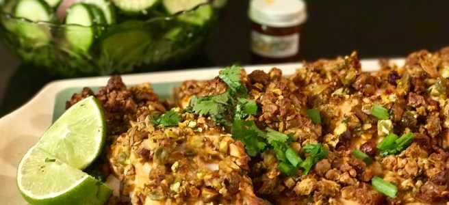 - 1 cup of pistachios — you can substitute walnuts if you’ve used up all your pistachios on the fish