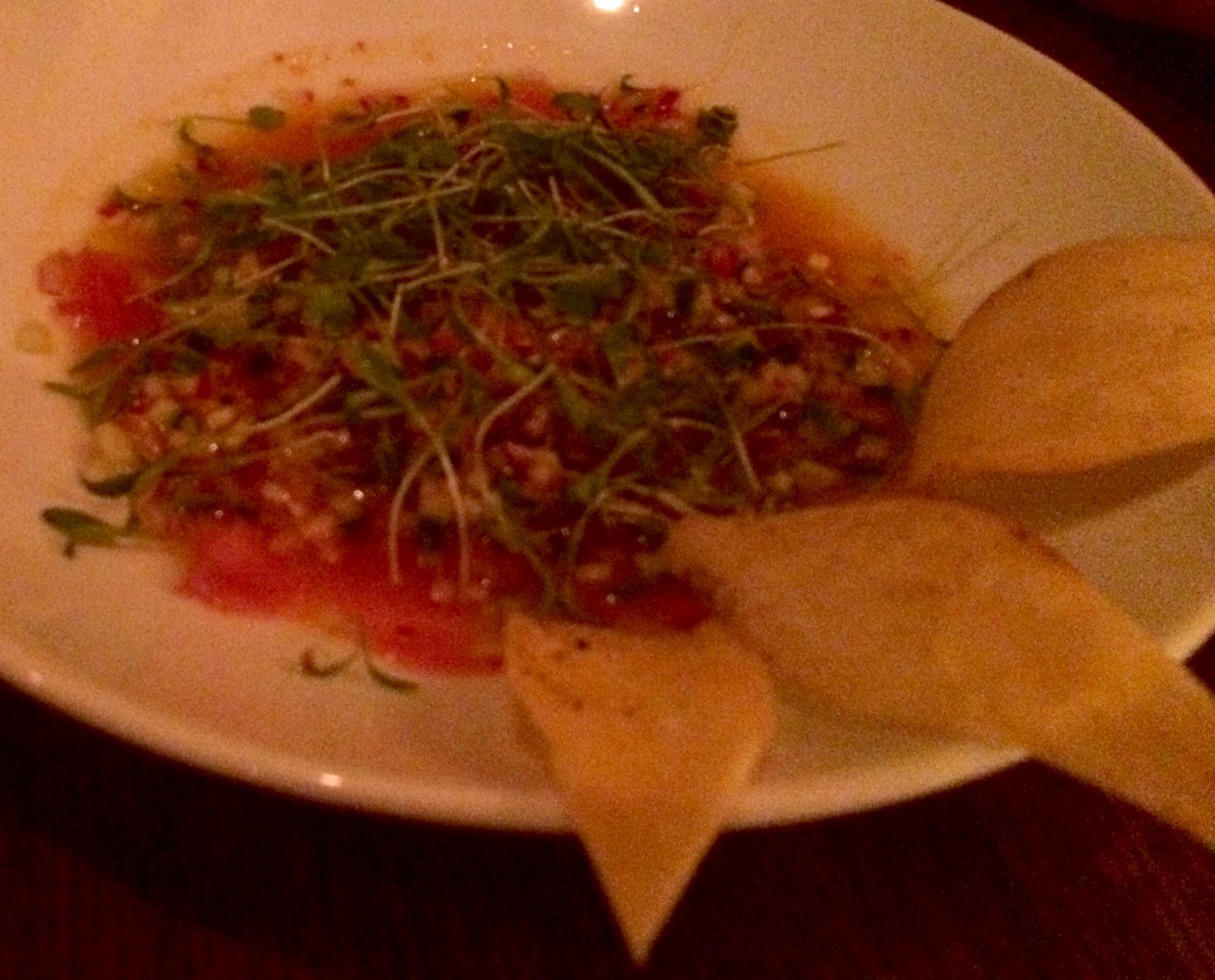 Ensalada de Betabel, translated to “beet salad,” was not super Mexican, but seemed very appropriate for a downtown Manhattan restaurant and tasty. The salad was a good mix of textures—the meaty grilled beets, soft goat cheese spread, creamy avocado, crunchy caramelized nuts, crunchy spinach leaves, and chewy radicchio. The beets were also the right temperature; often, kitchens serve beets that are ice-cold, which I think dilutes the sweet flavor of the beets, but here they were served room temperature.