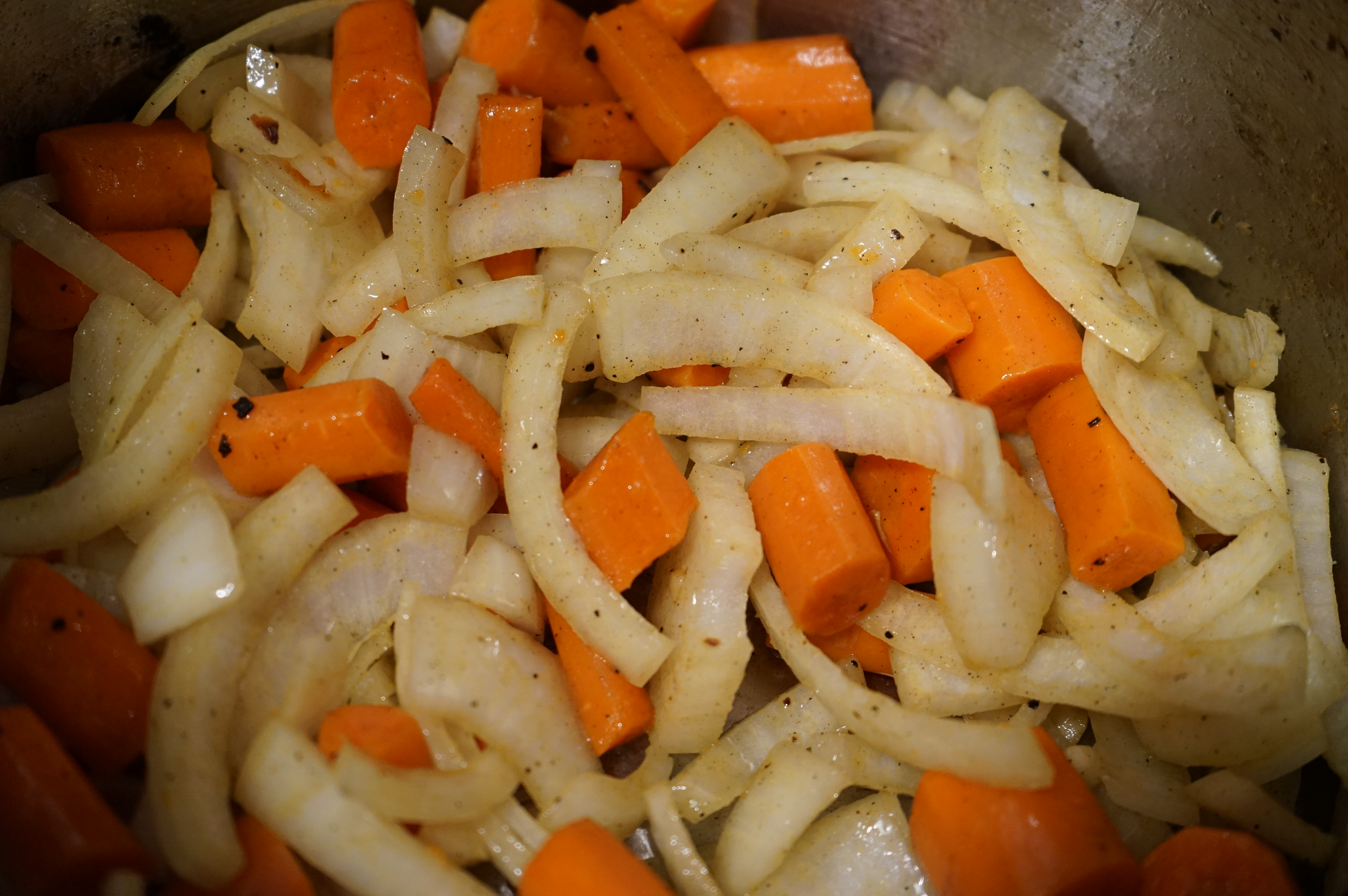 - Add a bit more oil and add in the chopped carrots and sauté for another couple of minutes, then add the garlic and one onion to the pot
