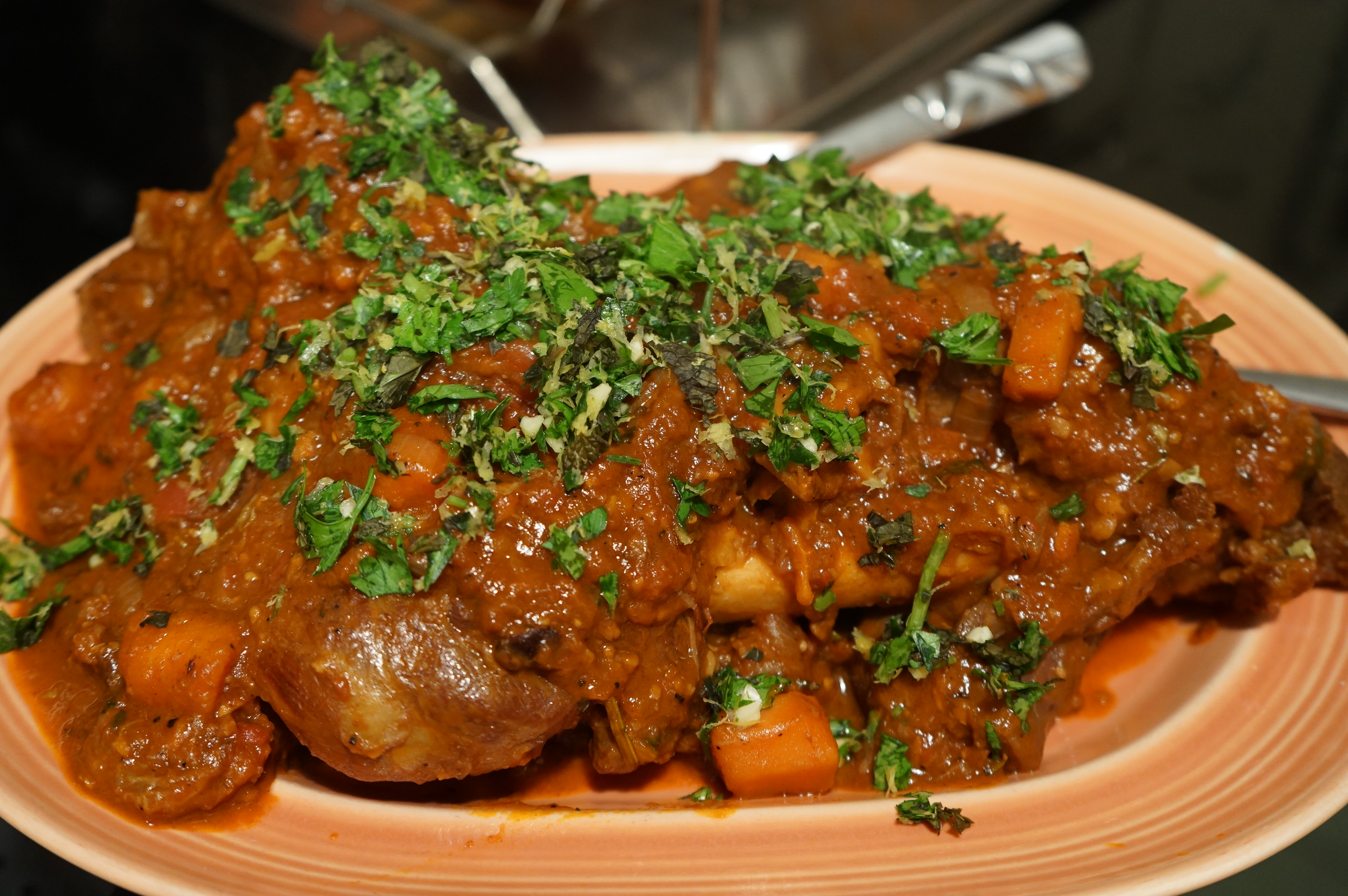 - Plate the lamb shank with the bone prominently displayed, and smother the meat with the braising liquid that’s chock full of carrots, herbs, onion, garlic, chickpeas and meat that’s fallen off the bone