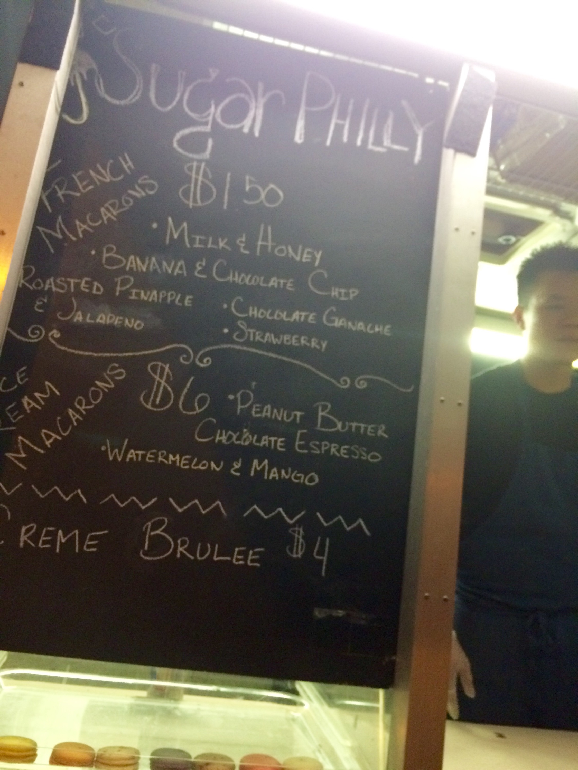 At this point, we were ready for dessert. The first stop was Sugar Philly for some amazingly, appetizing French Macaron ($1.50 each). The strawberry was a bit tart and had a nice berry flavor that perfumes the cookie. The banana and chocolate chip flavor was a nice balance of sweetness from the chocolate and mellow banana flavor. The milk and honey macaron had the flavor of the best angel food cake, but sweeter. The final one was watermelon and mango and was awesome; it wasn’t too sweet but had a wonderful fruit flavor and a burst of summer in my mouth. All of the cookies had crisp edges with a wonderful chewy texture. The cream in the middle was just the right amount as to not overwhelm the delicate cookies.