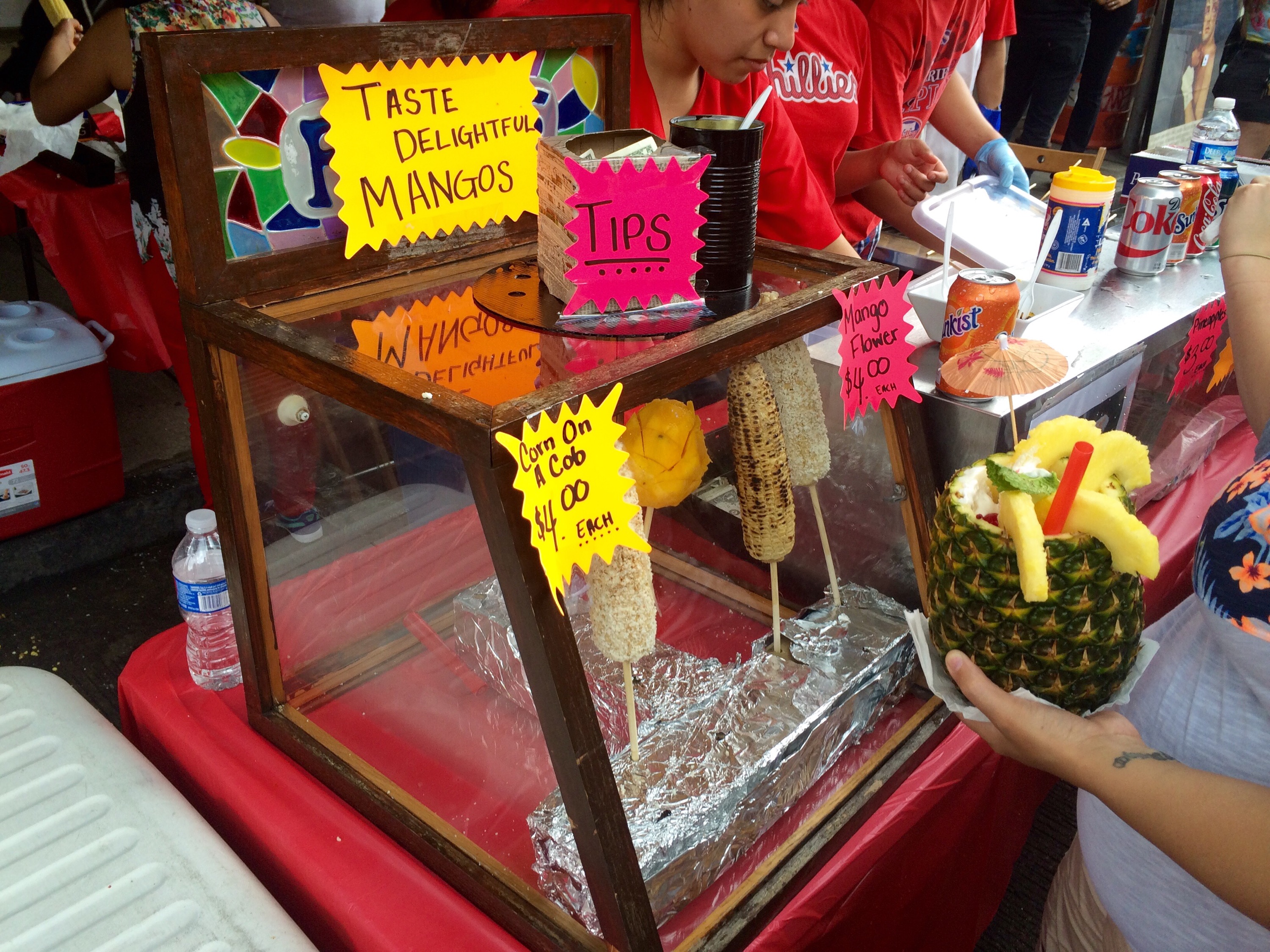 My next eat wasn’t very Italian, but I couldn’t resist. There happen to be a few Latin shops in the Italian Market area, so I wasn’t that surprised to see the popular Mexican street corn ($4) being sold at a few stalls. The corn cob was slathered with mayonnaise and then covered with Mexican cotija cheese. The corn itself was so juicy, and every time I took a big bite, juice would go flying. The cheese wasn’t as salty as Feta, but gave each bite great texture. The mayo didn’t add much taste and mostly acted as the glue for the cheese and corn. The corn had that perfect amount of summer sweetness and was perfectly cooked, though it could’ve done with a bit more char for my taste. They were also selling some grilled, roasted mango in “mango flower,” so I took a sample. The mango was so sweet and delicious. It would have been perfect for salsa.