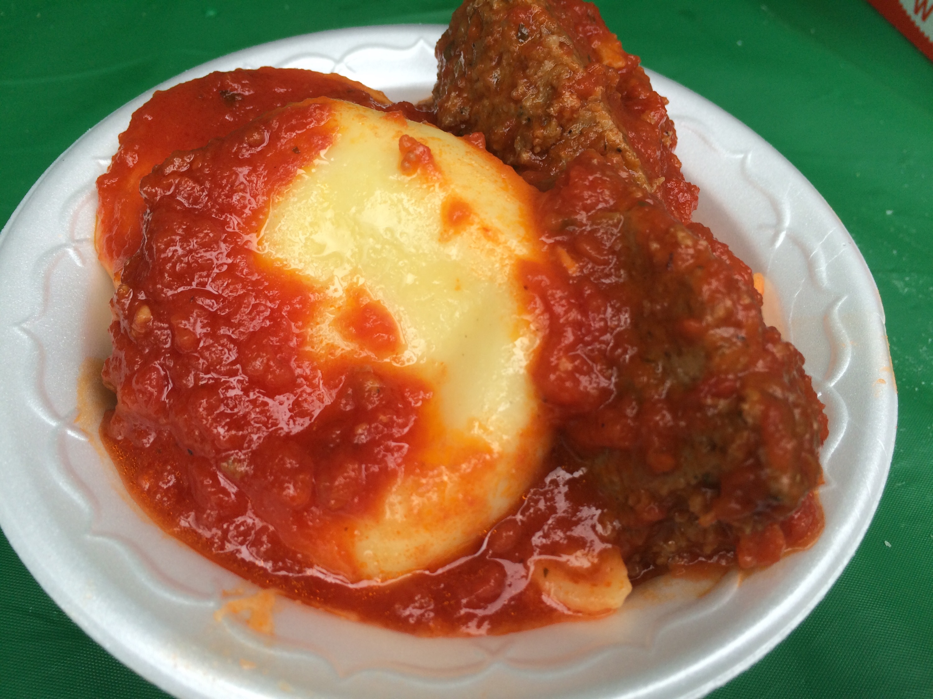 My final stop of the day was at the famous Talluto’s Authentic Italian Food that was selling their homemade pasta to long lines of hungry Philadelphians. It was hard to decide for me as to what I wanted, so I had a bit of a combo bowl ($8). The cheese ravioli were pillows of pasta surrounding a slightly grainy but creamy ricotta filling–much more savory and thinner than the cannoli filling. The ravioli presented a greater surface area for the tomato sauce which was very basil heavy, sweet snd chunky. The other half of my bowl was penne with vodka sauce, and the ridges on the penne allowed it to catch more of be sauce. The vodka sauce had a peppery bite that came off as spicy, but not hot. Overall the pastas were pretty saucy and pieces of the meatball would break off and incorporate into the sauce. It very much allowed for a cohesive eating experience. The meatballs were absolutely delicious. They have a generous portion of two big meatballs. They must have used a nest blend because not only could you see the different meats in the ball as it was split open, but the meatball stayed very moist and juicy. It didn’t suffer from the downfall of many meatballs where it dries out due to being in a larger piece of meat and sitting out. This pasta and meatball bowl was the perfect way to end my Italian Market experience and sent me home with a belly full of tasty Italian treats.
